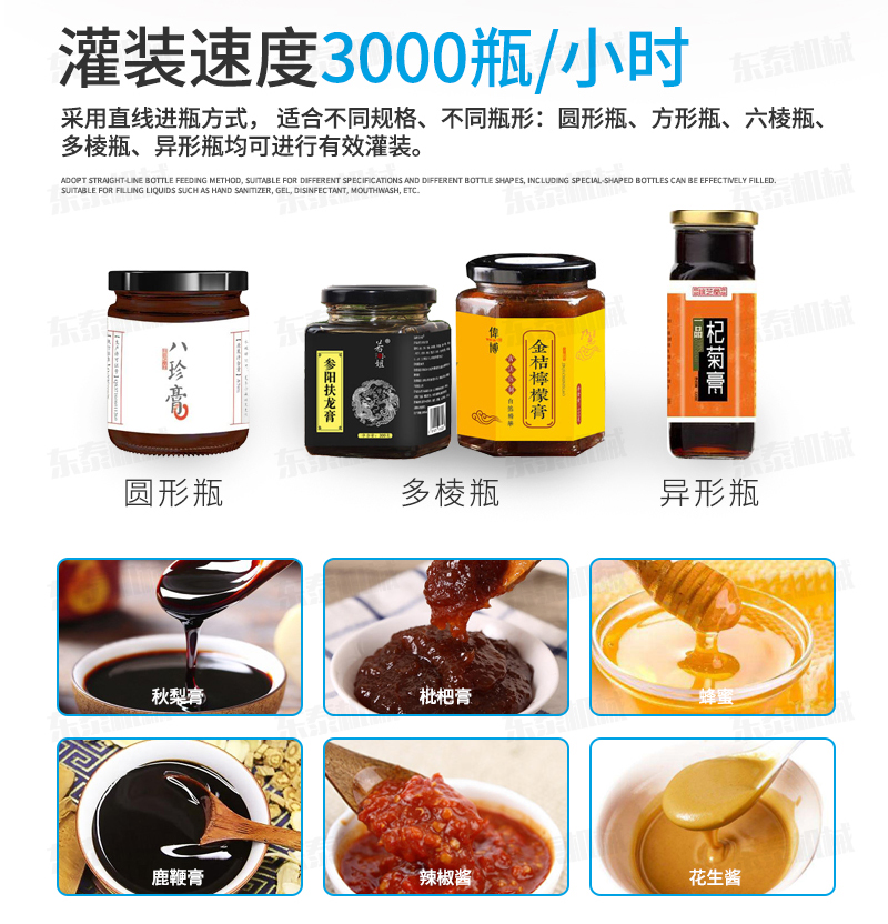 枇杷膏灌裝機(jī)生產(chǎn)線適用于各種1、各種膏滋如:秋梨膏、枇杷膏、鹿鞭膏、蜂蜜等的灌裝。2、調(diào)味醬如:香菇醬、辣椒醬、豆瓣醬、花生醬、芝麻醬、牛油火鍋底料、紅油火鍋底料。3、采用多規(guī)格的灌裝轉(zhuǎn)閥、灌裝頭,可適應(yīng)不同客戶物料的灌裝需求。