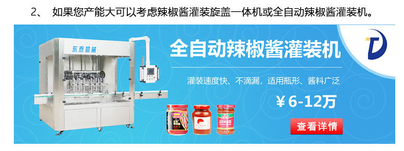 適用范圍:小型辣椒醬灌裝機(jī)主要適用于那些含顆粒的顆粒漿狀流體、半流體、膏體、醬狀類的物料灌裝,各種勻質(zhì)醬料、火鍋底料、老干媽辣椒醬、干煸牛肉醬、泡椒、牛肉粒醬、香菇丁醬、八寶菜、蘿卜丁、含干煸臘肉丁、辣子雞丁、油炸花生等大顆粒、含油量少等干煸辣椒醬的灌裝。