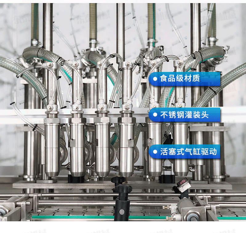 H、該機(jī)有6 個(gè)灌裝頭,由6個(gè)氣缸驅(qū)動(dòng)、灌裝物料更加快速。