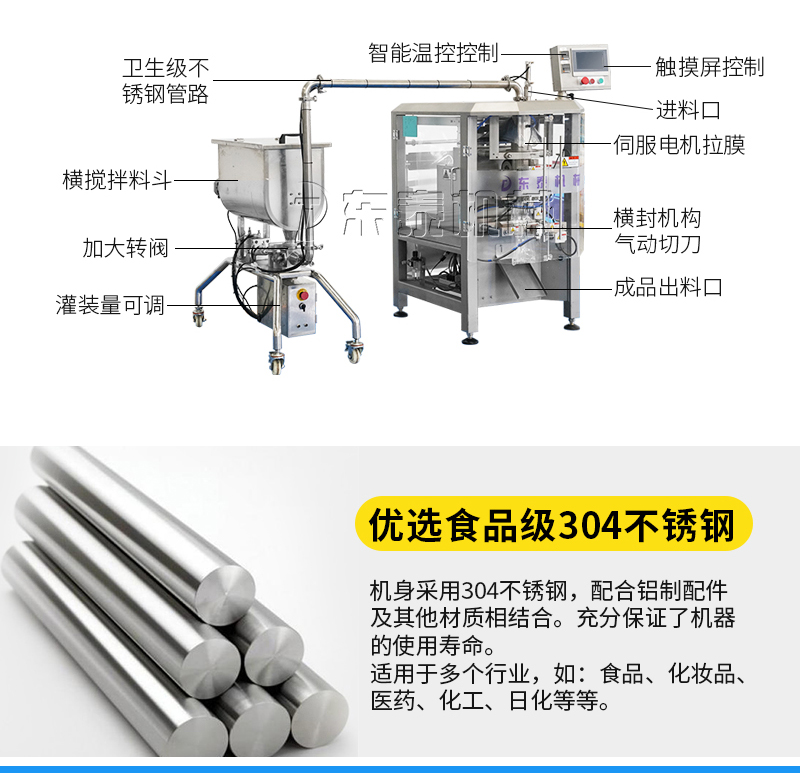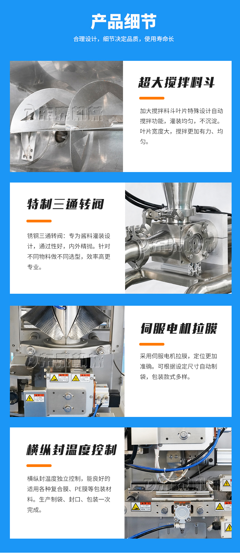 牛肉醬灌裝包裝機(jī)械主要用于調(diào)味品醬料的自動化包裝,機(jī)器安裝有橫向螺帶式攪拌,使油醬混合均勻,確保灌裝精度和產(chǎn)品包裝成品的均勻性。灌裝計量設(shè)備安裝有萬向輪,管路鏈接均采用快拆接頭,方便灌裝機(jī)拆卸移動清洗。包裝設(shè)備采用全伺服驅(qū)動器,包裝速度快,運(yùn)行穩(wěn)定。