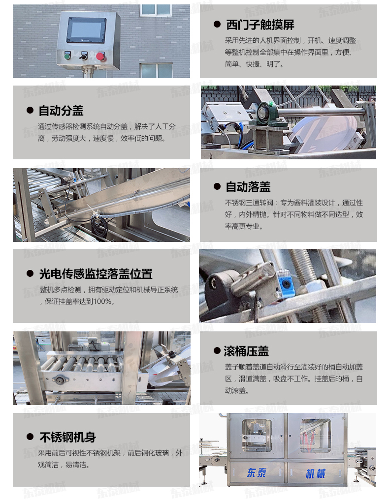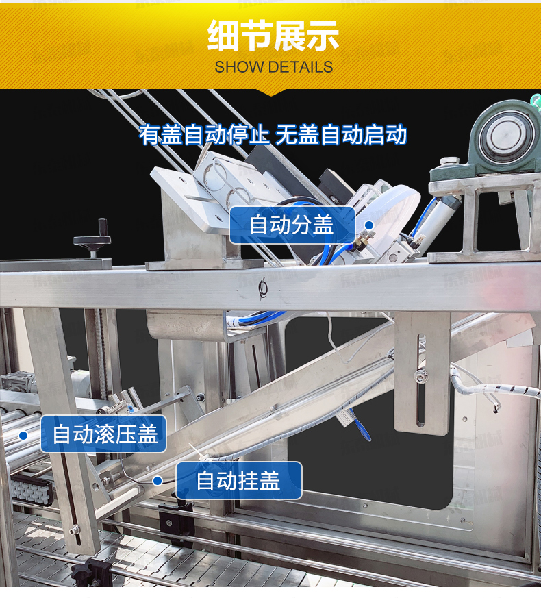 防凍液自動壓蓋機主要用于大桶塑料蓋旋蓋,結(jié)構(gòu)上采用了光電傳感監(jiān)控傳感旋蓋。壓蓋時施力均勻。同時該機具有造型美觀、結(jié)構(gòu)緊湊、設(shè)計合理、運行穩(wěn)定、噪音小、封口速度快、壓蓋質(zhì)量好等特點。