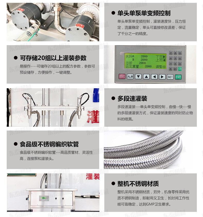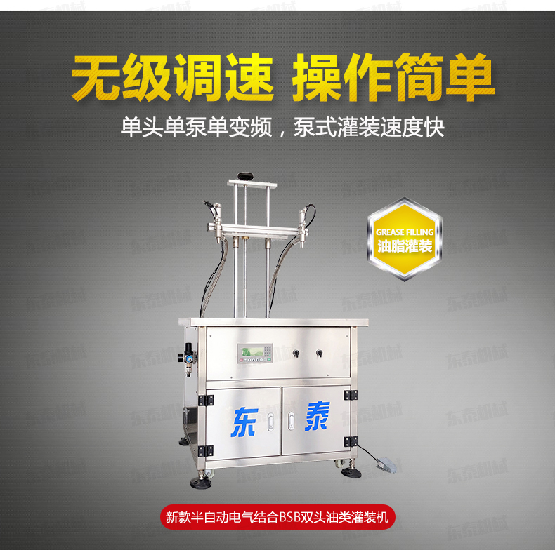 本半自動(dòng)雙頭油類灌裝機(jī)適用于各種食用油、潤滑油等粘液體的定量灌裝,如花生油,大豆油,菜籽油、香油,潤滑油等油類的灌裝。采用先進(jìn)的定量灌裝技術(shù),結(jié)合微電子智能控制技術(shù)單頭單變頻控制系統(tǒng)、無級調(diào)速,操作簡單。各個(gè)灌裝頭可在一定范圍內(nèi)任意調(diào)節(jié)間距和灌裝量,可使用各種大小形狀的容器的灌裝。自動(dòng)化程度高。另外,機(jī)身零件采用優(yōu)質(zhì)不銹鋼制造,即耐用又衛(wèi)生,長時(shí)間工作性能可靠穩(wěn)定。達(dá)到GMP衛(wèi)生要求。本公司產(chǎn)品通過了IS9000質(zhì)量體系認(rèn)證。本設(shè)備經(jīng)久耐用,性能穩(wěn)定,是食用油、潤滑油等行業(yè)理想的灌裝設(shè)備。